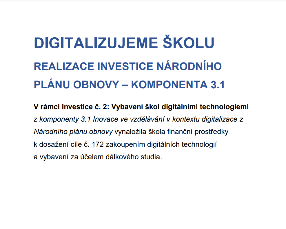 Naše škola obdržela finanční prostředky z Národního plánu obnovy a to komponenty 3.1. Inovace ve vzdělávání v kontextu digitalizace. Finančním zdrojem této intervence jsou prostředky fondu EU – Next Generation EU. Jedná se o finanční prostředky na: